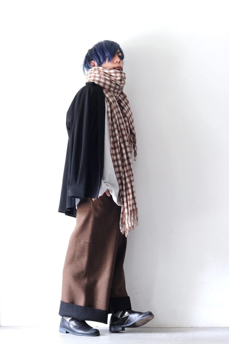 suzuki takayukiのチェックのストールをアクセントに、ETHOSENSのメルトンワイドパンツの色味を合わせて統一感をもたせました。