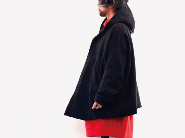 Licht bestrebenのフーデッドコートをメインに、インナーには差し色使いとしても見事な存在感となるSTORAMAのニットパーカー。そしてそのインにはLicht Bestrebenのロングタートルをレイヤードしております。